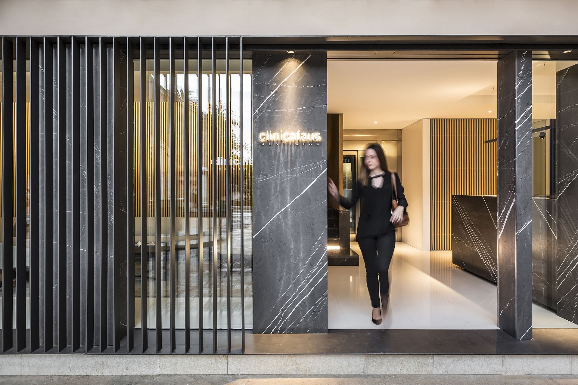 The refurbishment will generate the opening of a large longitudinal window along the main façade of the clinic, covering the pillars with stone material (Pietra Grey) and leaving these recessed from the outer line of the façade. Externally, there will be a series of vertical slats of dark-toned metal sheet framed by a sheet of the same material, which cast a series of very controlled shadows inside and protect us from direct sunshine. The carpentries that conform the closing will be elements of high benefits, being of anodized aluminum and hidden frame. In the access there will be a motorized sliding leaf.