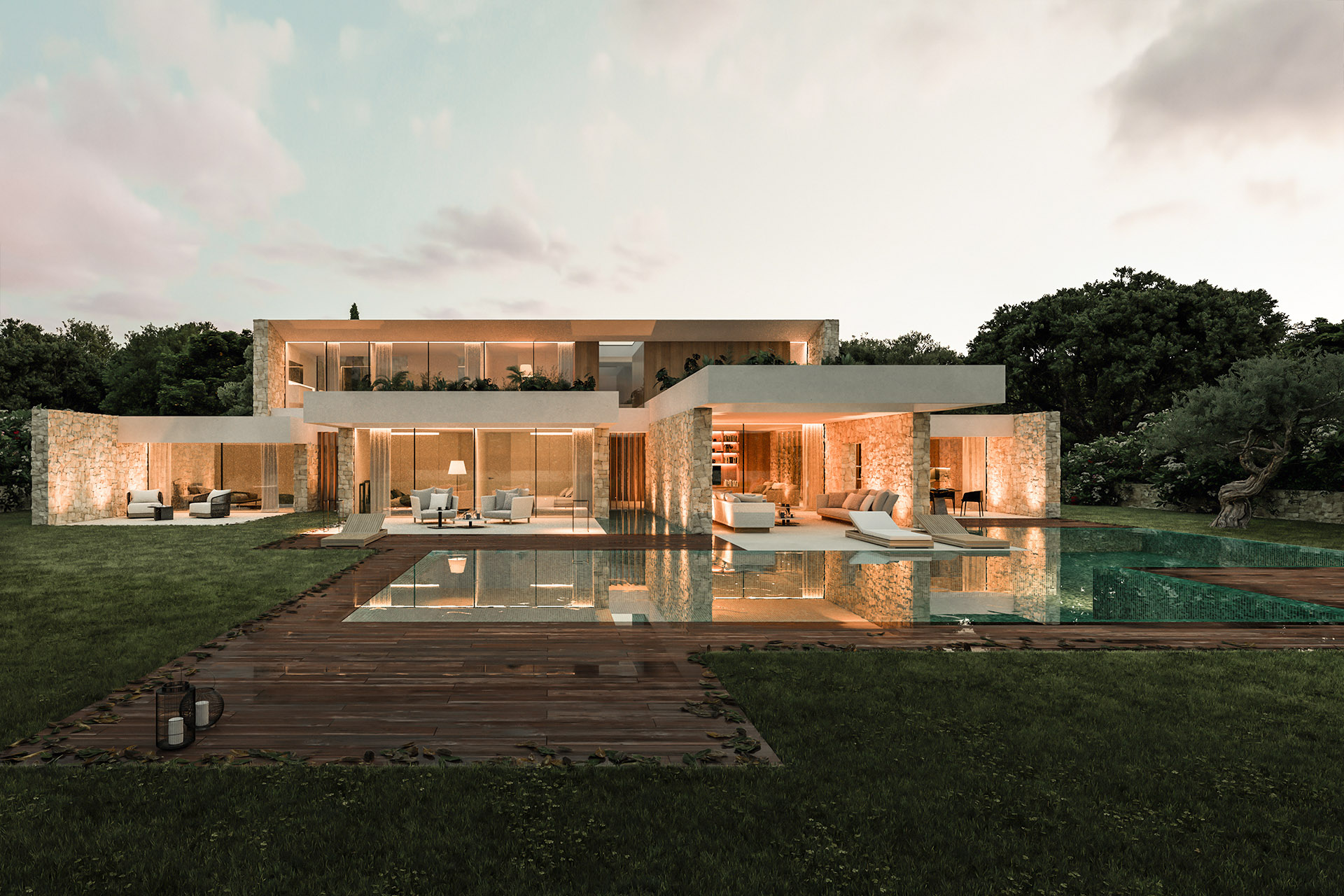 The whisper of the leaves caressed by the fresh wind of the sierra. The undulating shade of the trees sliding down the warm walls. Walls that move forward and backward in search of the appropriate privacy of each space. Powerful garden terraces that in audacious cantilevers form covered spaces that, uninterrupted, penetrate the diaphanous interiors of the rooms, between wide windows and textured woods. At their feet, the sheet of water that reflects a solid architecture of pure geometry. And on the horizon, the vast sea of oaks that vanishes into the distant south… a dreamlike place to live.