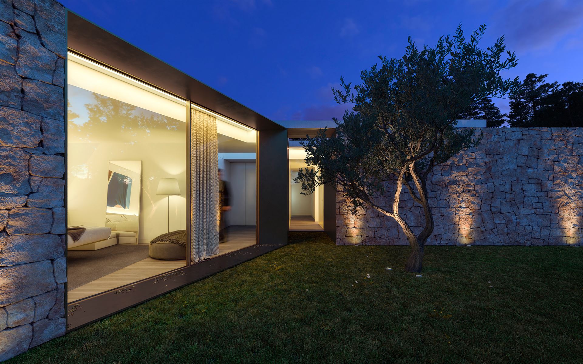 The night zone is configured by a solid volume of masonry walls perforated by framing controlled visuals and in contrast with the sensation of lightness of the day zone.