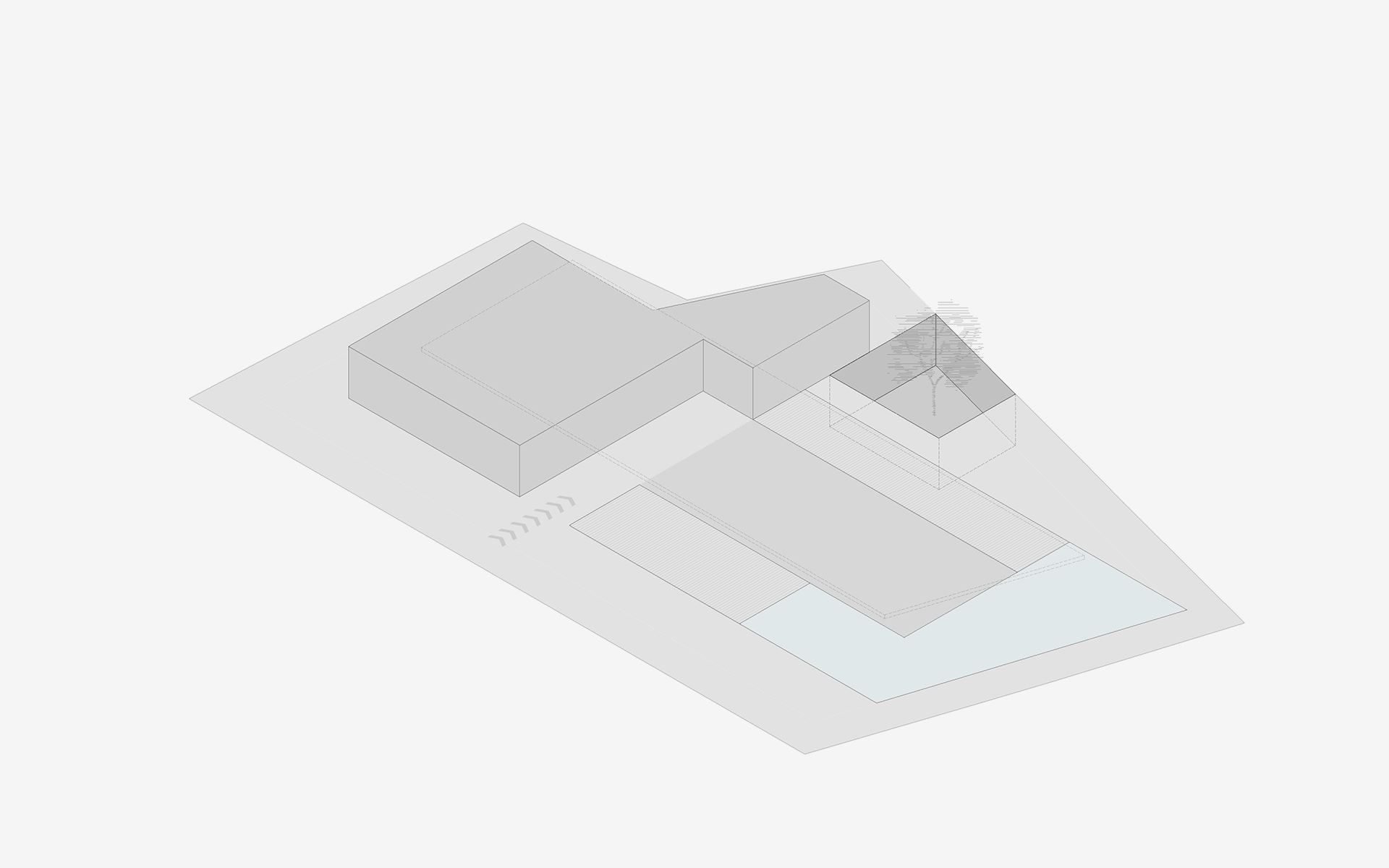 A massive body on the north side serves as an anchorage for the flight of the light forging that generates this duality between mass and ether. The swimming pool appears as an element that embraces and is introduced in this light flown plane. A subtraction of land allows to create a backyard for the lower floor.