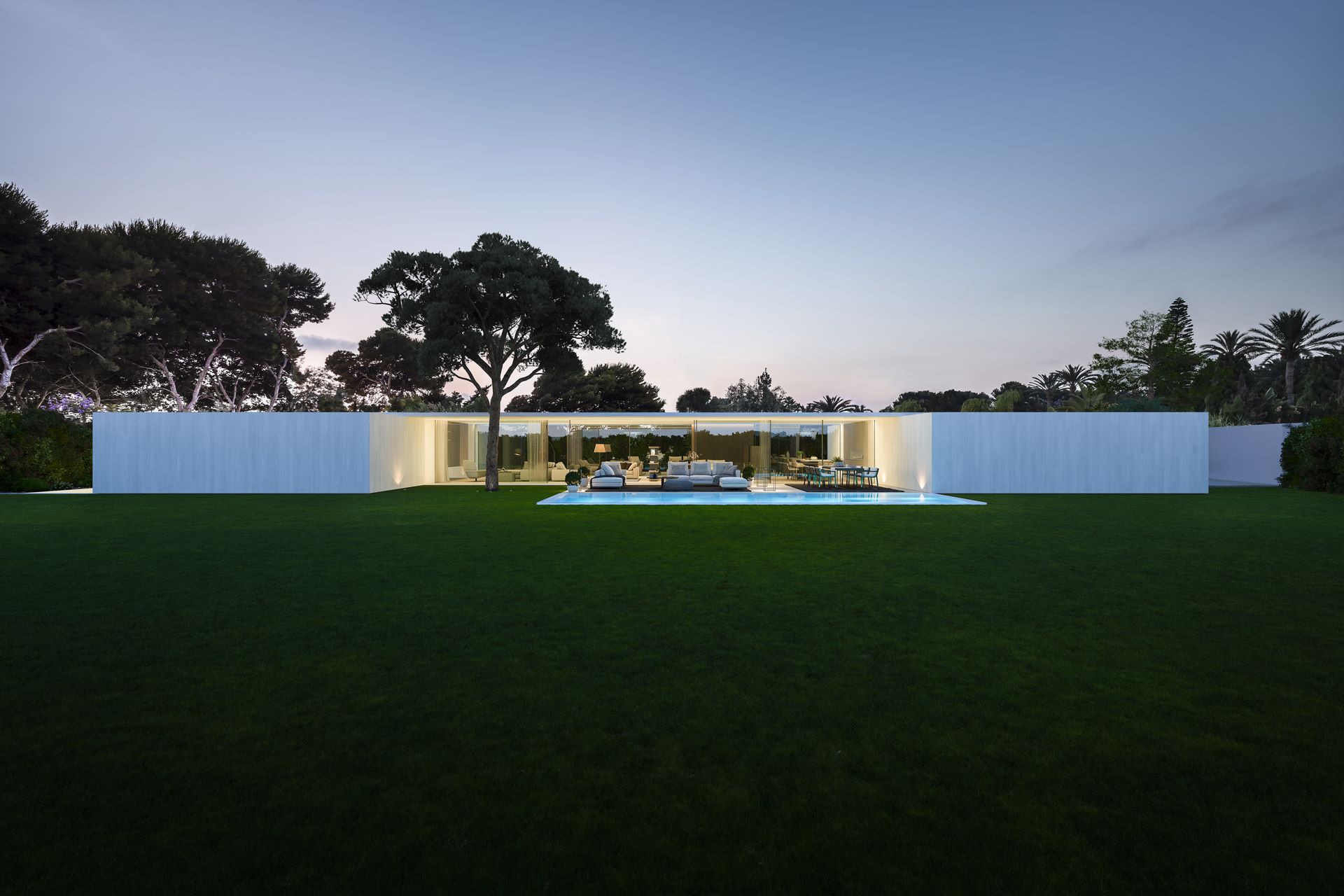 The conditioning factors of the site and the programme lead to a volumetric duality in which the night and access areas are made up of much more compact pieces at the end of the building, while the day area contained between both enjoys a transversal opening towards the garden space. To cover the day zone, the light element is used to avoid the gravitational heaviness that a mass solution would impose. Two prisms between which the fine plane of a minimum roof is stretched define the architecture of this dwelling in Alicante.