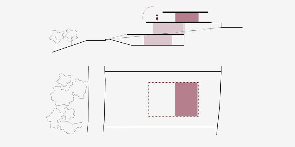 The ultimate image of the architecture is materialised by the light planes which, from the tamed hill, cantilever out into the landscape. The rhythm created by the sliding of the different elements reproduces a slow descent towards the lower level.