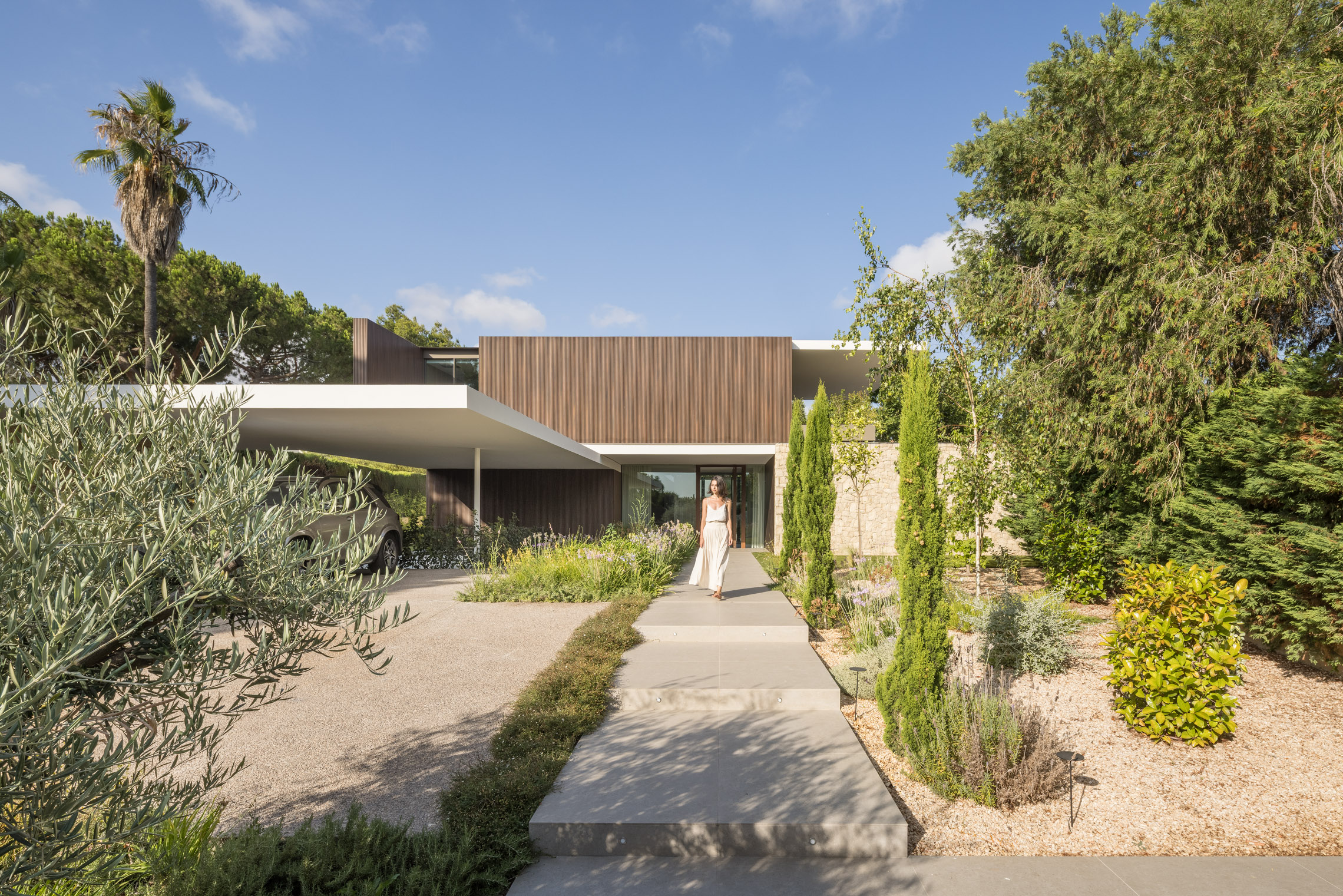 La vivienda cuenta con un único acceso desde la calle, por tanto, el objetivo se centra en desarrollar dos recorridos de entrada independientes, uno para el tráfico rodado y otro peatonal. Una masa vegetal acompaña al visitante en su aproximación a la casa a lo largo del eje este-oeste, impidiendo visuales directas entre ambos recorridos.