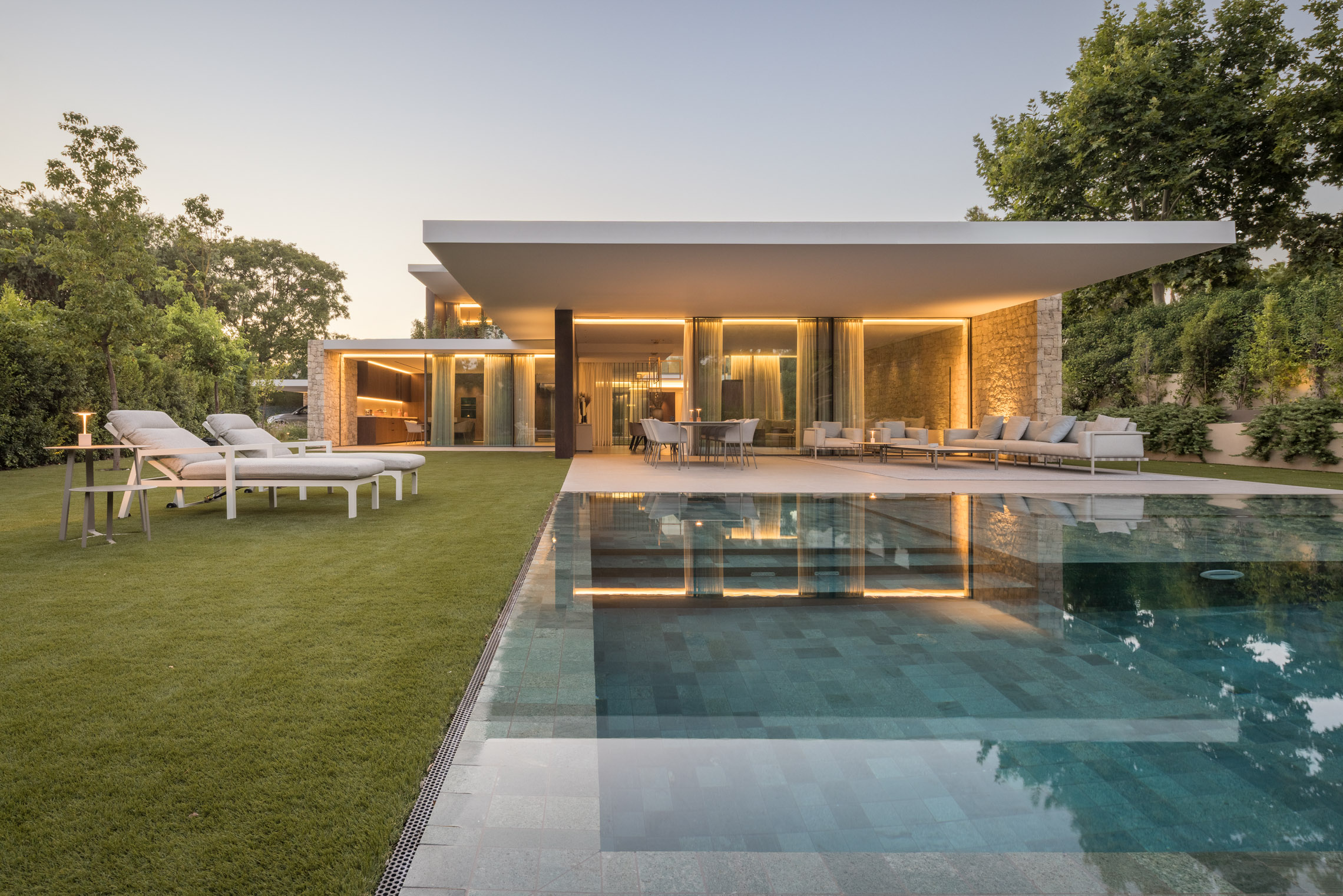 La arquitectura se extiende en planos en voladizo, suspendidos, desafiando suavemente la gravedad. Sus líneas horizontales se proyectan hacia el vacío y encuentran en el agua de la piscina un espejo silencioso, donde la casa se duplica y se vuelve etérea. El límite entre lo construido y lo reflejado se diluye.