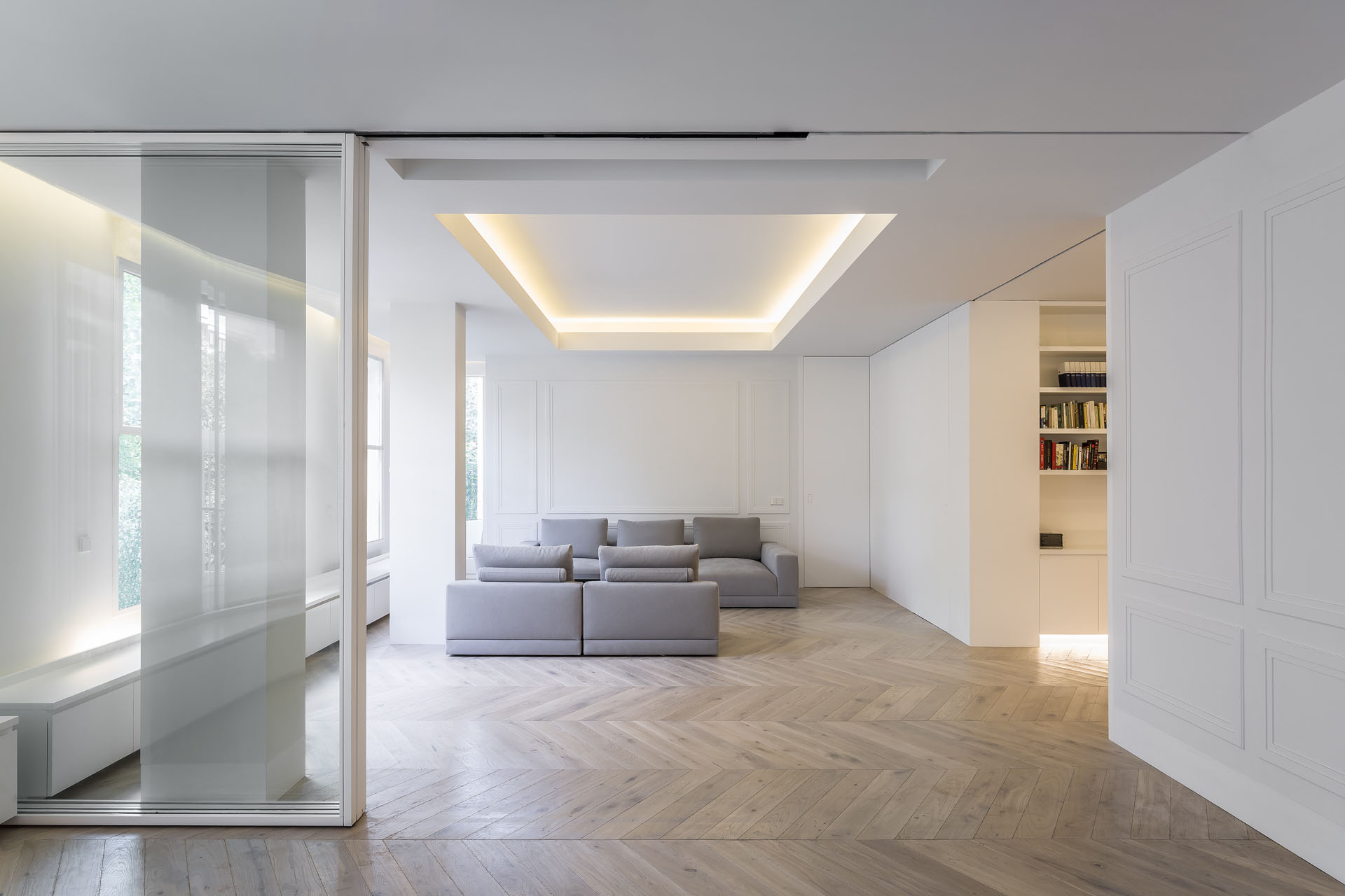 La reforma organiza el proyecto en dos ejes distributivos. Un eje perpendicular arranca en el vestíbulo y va engarzando las distintas estancias de la zona de noche en una fuga profunda hacia el verde de las hojas. El eje paralelo acompaña en su trayectoria curvilínea a la fachada decimonónica, desplegando a lo largo del amplio vano los espacios destinados a zona de día.