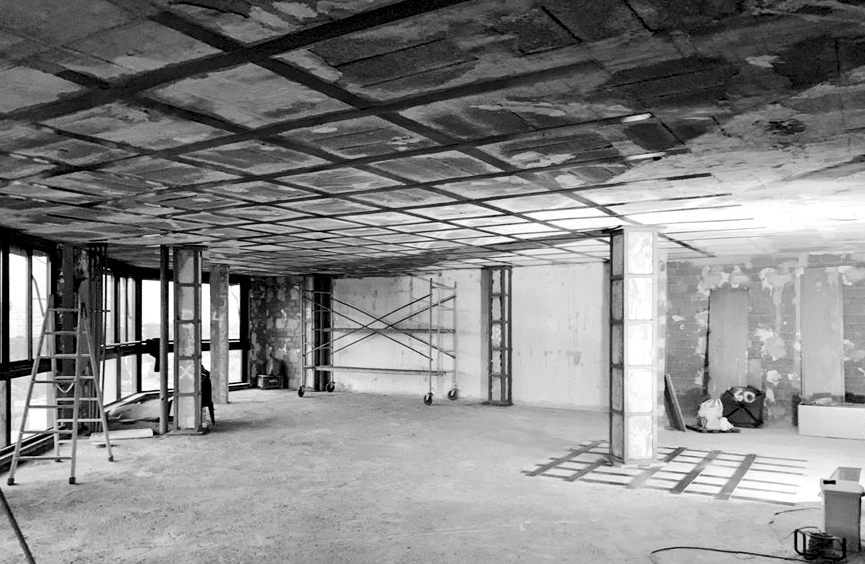 La primera fase ha consistido en un refuerzo estructural con tiras de fibra de carbono en el forjado bidireccional existente según las indicaciones de David Gallardo (Estructuras Singulares UPV).